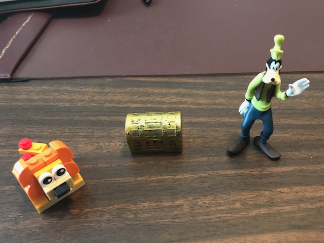 I have a lot of others things on my desk and a lot of stuff in my office. I need my calendar, tissues, and scissors; and I use many of my files and books; but my goofy, my treasure chest, and my Lego lion are special!